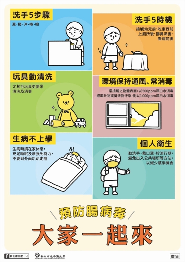 確實做好個人衛生,落實正確勤洗手,避免將病毒傳給家中其他嬰幼兒,生病請假或配合停課的學幼童,應在家好好休息,不要到補習班、安親班或其他擁擠的公共場所活動,避免疫情蔓延。