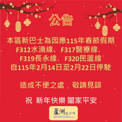- 1.F312水湳線、F317醫療線、F319長永線、F320民蘆線:115年2月14日至115年2月22日停駛。